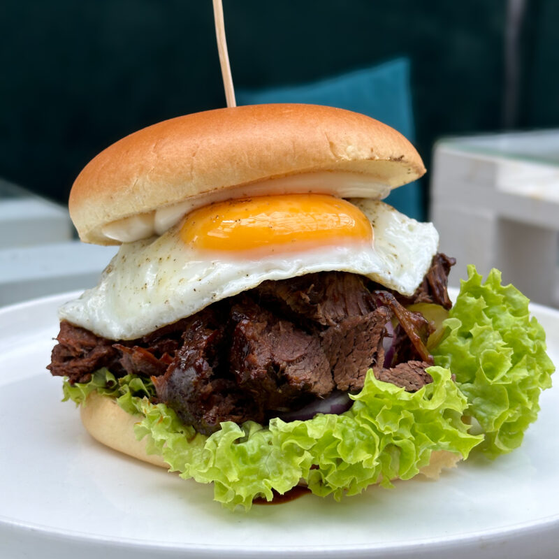 sałata/ pomidor/ ogórek kiszony/ czerwona cebula/ siekane policzki wołowe/ jajko sadzone/ BBQ/ majonez