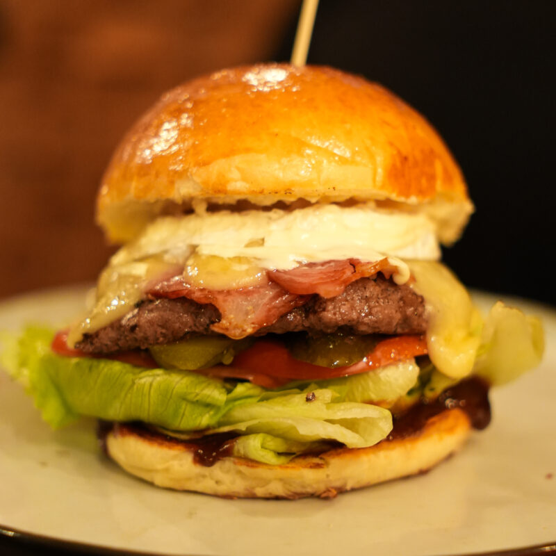 Wołowina/ sałata/ pomidor/ ogórek kiszony/ konfitura z cebuli/ boczek/ camembert/ sos BBQ/ majonez