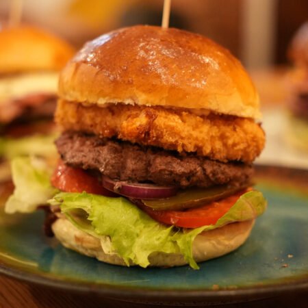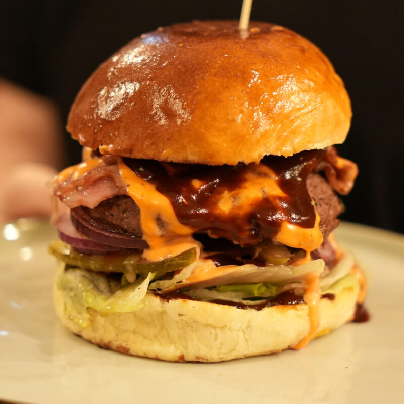 Wołowina/ boczek/ sałata/ rukola/ pomidor/ czerwona cebula/ ogórek kiszony/ sos BBQ/jalapeno/ sos serowy