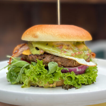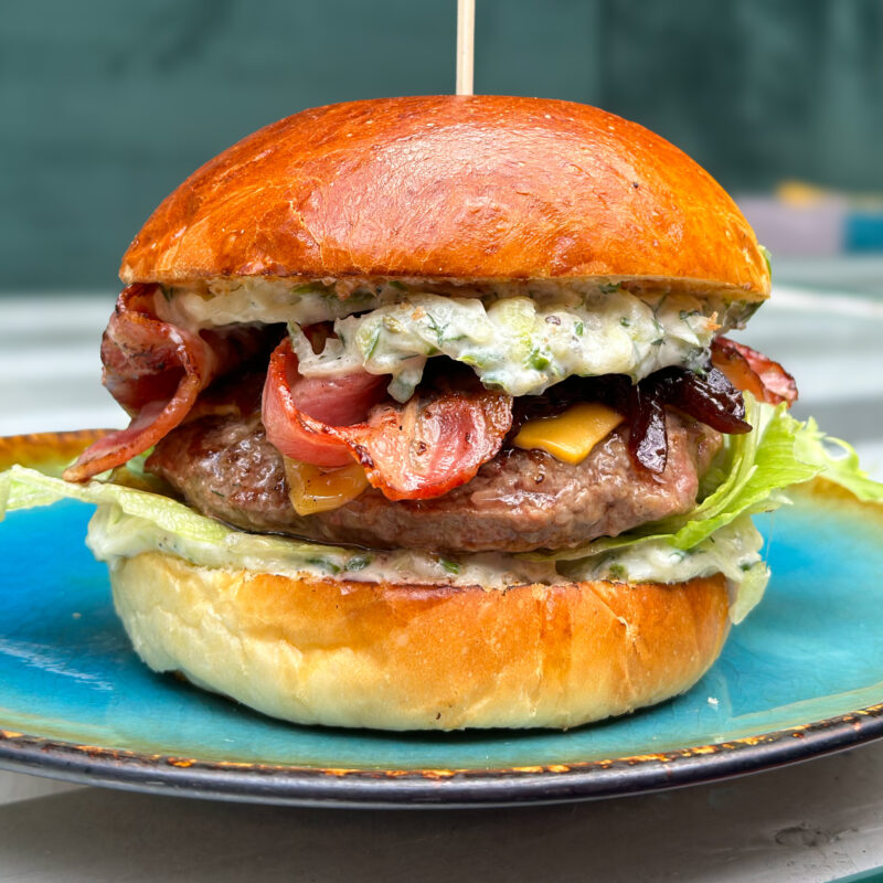 Wołowina/ boczek/ cheddar/ sałata lodowa/ konfitura z cebuli/ sos tzatziki