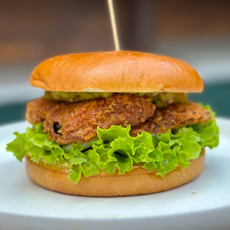 Panierowana cukinia/ sałata/ pomidor/ ogórek/ guacamole/ rukola